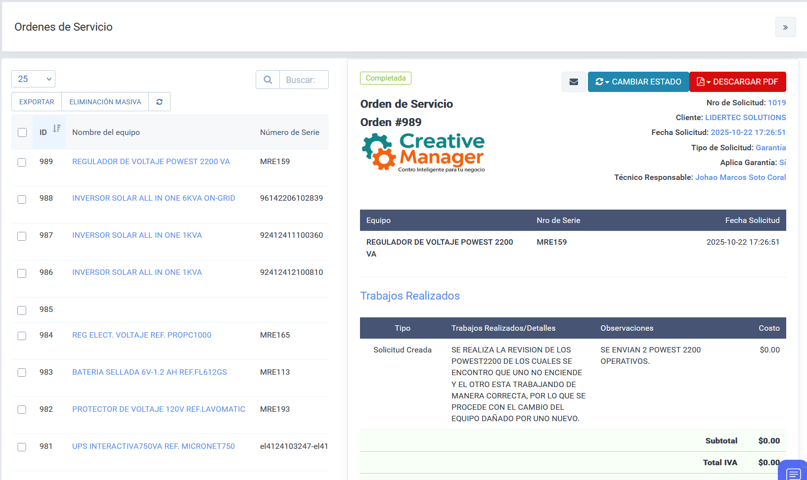 Garantías, órdenes y repuestos con captura en campo e integración al CRM.